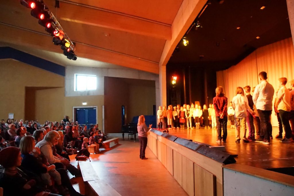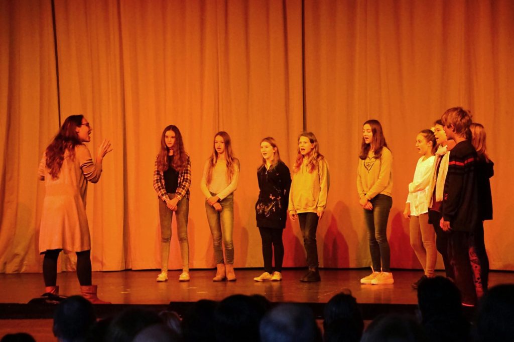 Der Chor der Mittelstufe hatte erstmalig nicht nur mit Manuel Wiencke, sondern auch mit der neuen Chorleiterin Sigrid Pröbstl, geprobt. Klangstark und beschwingt sang der Chor das Volkslied „Es saß ein klein wild Vögelein“, die Pophymne „Mad World“ sowie „Swing Low, Sweet Chariot“ und das Wiegenlied „All Day, All Night“.