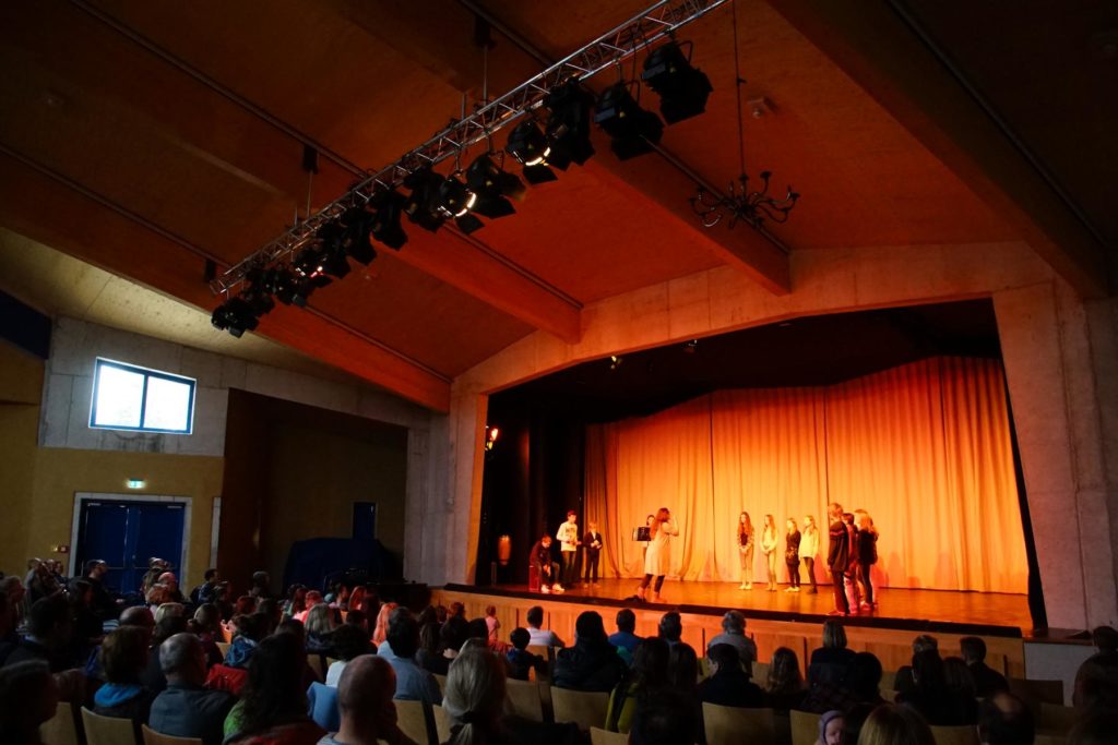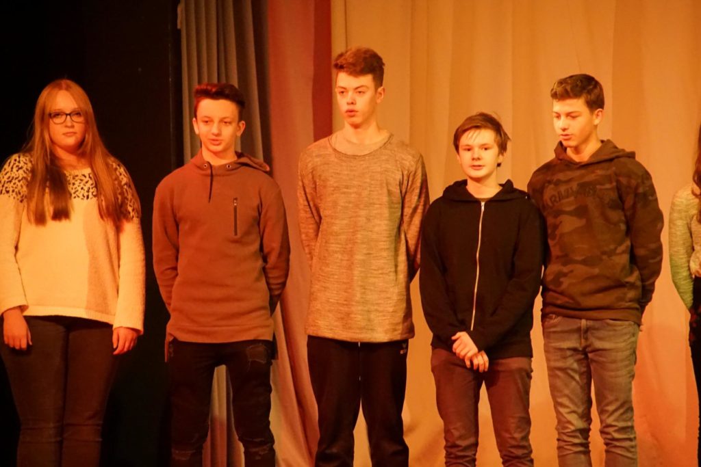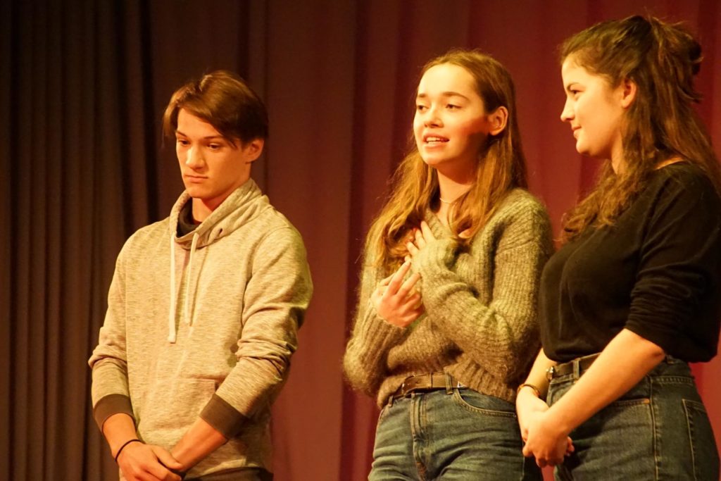 Die Streicher der Oberstufe spielten drei Stücke von Bodin de Boismortier, Vivaldi und Schostakowitsch. Der ehemaliger Schüler und Musikstudent Alvar Ceamanos war kurzfristig als Dirigent eingesprungen. Er dirigierte äußerst präzise. Eine kleine Streichergruppe der tiefen Stimmen (Celli und Bratschen) spielten mit warmem Klang den Boismortier, die beiden Cellisten der 12. Klasse Linus Braun und Elena Nolde hatten die Soli beim Vivaldi sehr gut gemeistert.