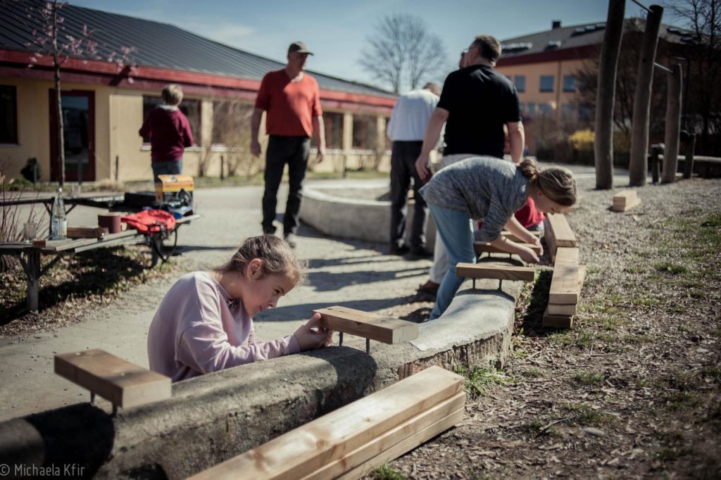 Derweil wartete die zweite Klasse der Landsberger Waldorfschule gespannt auf das Staffelholz, denn sie war für den Empfang auserkoren. Der Ankunftstermin um 12.30 Uhr verstrich, und die Spannung stieg. Ein Kind nach dem andern ging Ausschau zu halten. Um 12.40 wurden die Radler endlich gesichtet und herzlich mit zwei schönen Liedern empfangen, bevor sie den Kindern von der langen Reise des Staffelholzes durch Deutschland erzählten.
