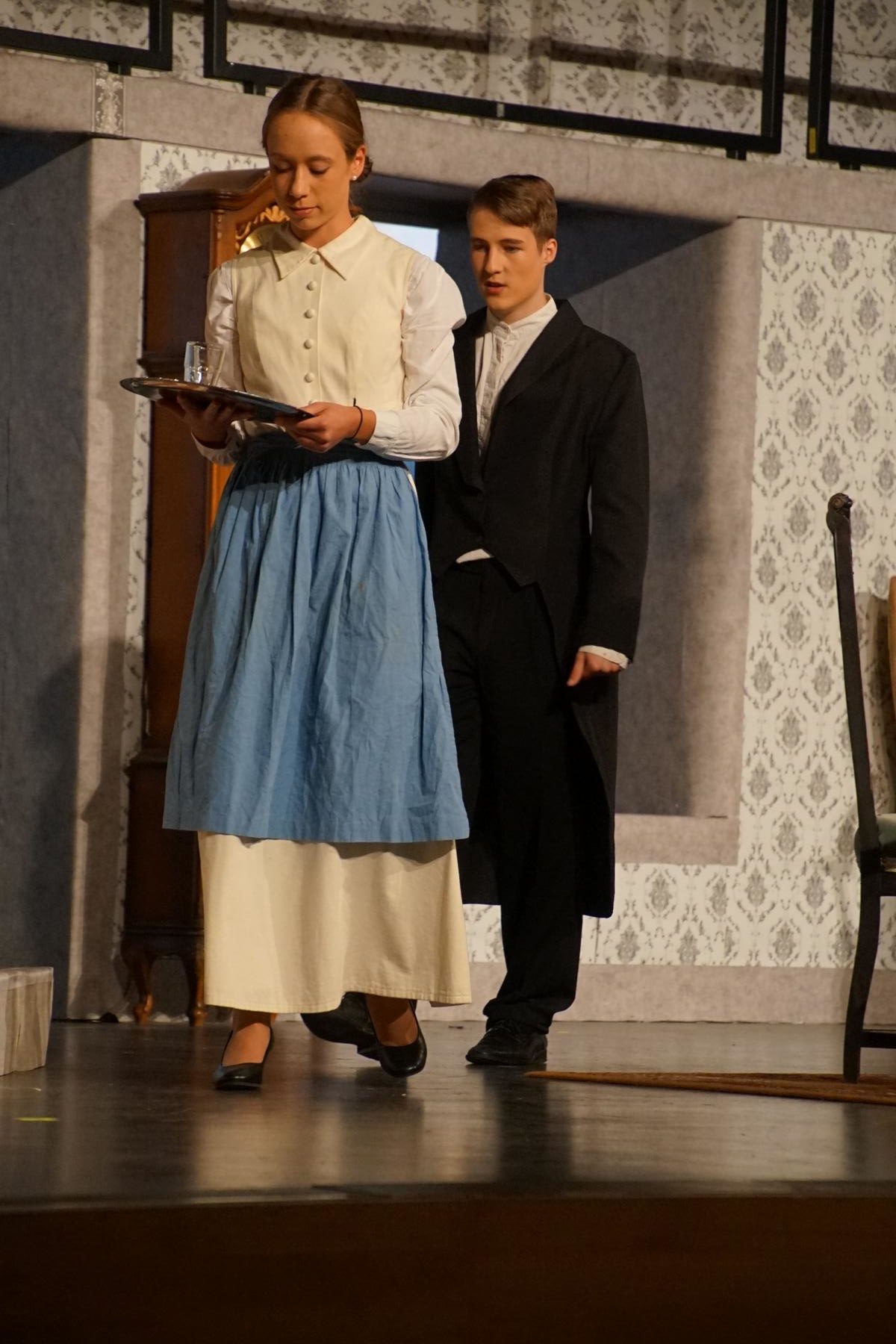 „Noch einen Drink?“ – Nur mit sehr viel Alkohol halten es die Gäste bei ihrem seltsamen Zusammentreffen in der Villa aus. Sie sind einer Einladung gefolgt und wundern sich jetzt gemeinsam, wer und wo der Gastgeber ist. Eine Stimme von einer Schallplatte zählt auf, welche Morde und unterlassene Hilfeleistungen die zehn besonderen Gäste begangen haben, für die sie bisher nicht von der Justiz belangt werden konnten. Noch am ersten Abend stirbt der erste Gast, in den folgenden Tagen sterben weitere … Agatha Christies Klassiker „Und dann gabs keines mehr“ in der Übersetzung von Michael Raab hatte Regisseur Uwe Henken mit den Zwölftklässlern stilgerecht inszeniert. In einem beeindruckenden Bühnenbild samt Treppe und Galerie konnten sich die Schauspieler:innen ausdrucksstark und lebendig bewegen und sprechen. Eine sehr schöner Theaterabend!