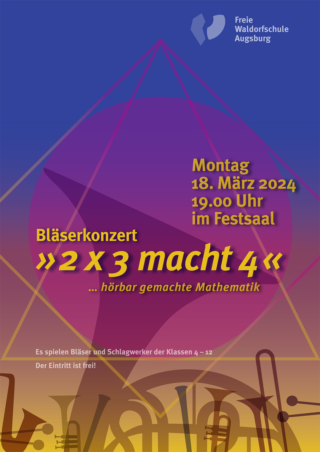 Herzliche Einladung zum Konzert der Bläser und Schlagwerker der Klassen 4 – 12 am Montag, den 18. März 2024 um 19.00 Uhr im Festsaal der Freien Waldorfschule Augsburg! Thema ist dieses Mal Musik als hörbar gemachte Mathematik z.B. „2 x 3 macht 4“. Der Eintritt ist frei – Spenden willkommen!