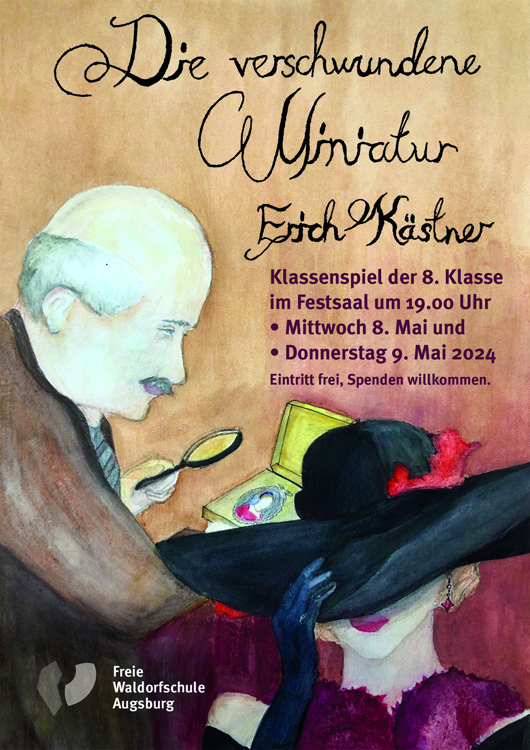 Herzliche Einladung zu den Theateraufführungen am Mittwoch, 8. und Donnerstag, 9. Mai 2024 jeweils um 19.00 Uhr im Festsaal der Freien Waldorfschule Augsburg. Die 8. Klasse freut sich auf zahlreiche Zuschauer!