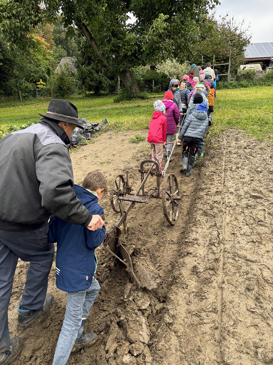 Endlich war es soweit – die Kinder (und Eltern) der 3. Klasse durften am eigenen Leib erfahren, was es bedeutet, ein Feld zu bestellen und Pflug und Egge mit eigener Muskelkraft zu ziehen. Die Kinder verbinden sich dabei mit der Ursprünglichkeit der Erde, die sie ernährt. Sie erleben in der Ackerbauepoche das HandinHandGehen von Mensch und Natur. Ein junger Mensch wird in seinem Selbstbewusstsein für das ganze Leben gestärkt, wenn er all diese Arbeitsschritte eigenhändig ausführt.