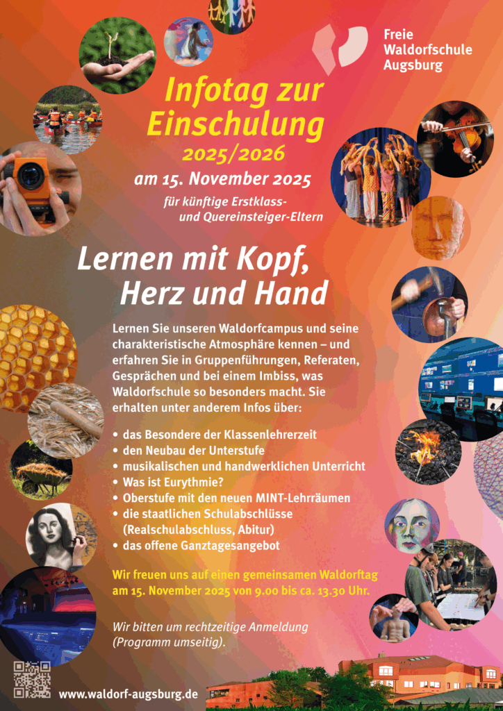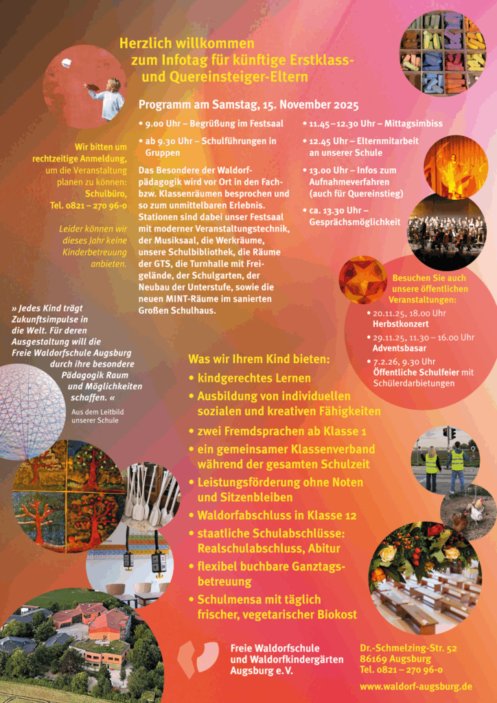 Lernen Sie unseren Waldorfcampus und seine charakteristische Atmosphäre kennen – und erfahren Sie in Gruppenführungen, Referaten, Gesprächen und bei einem Imbiss, was Waldorfschule so besonders macht. Sie erhalten unter anderem Infos über: