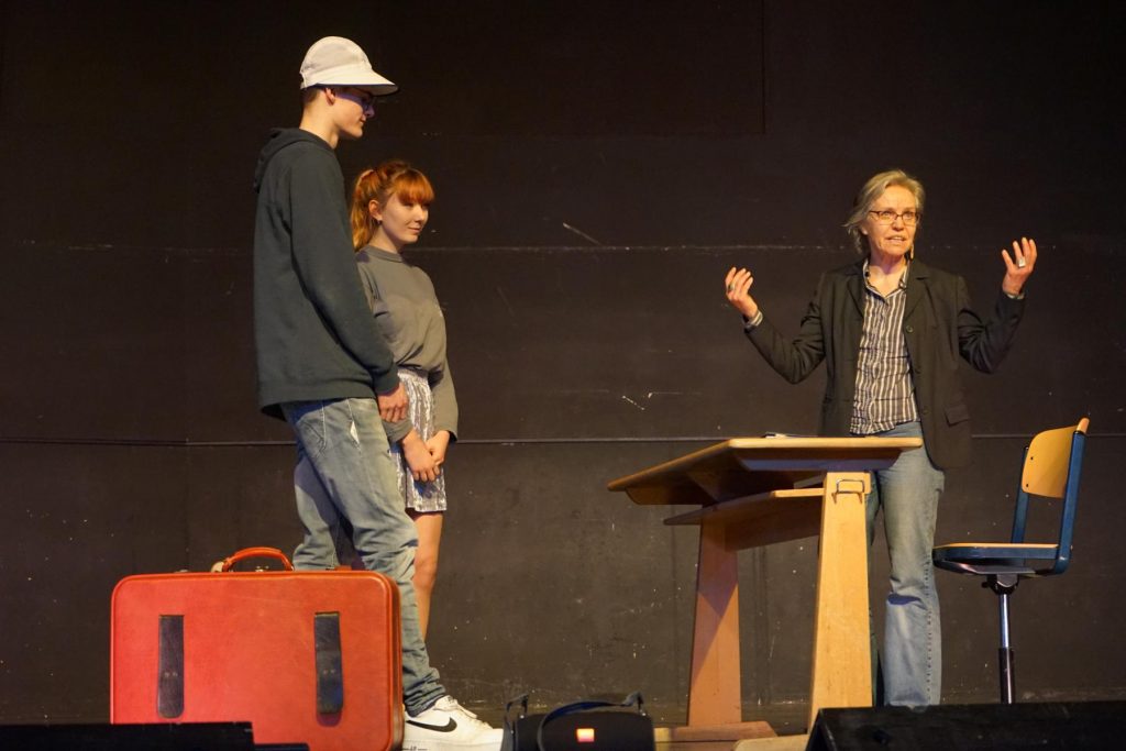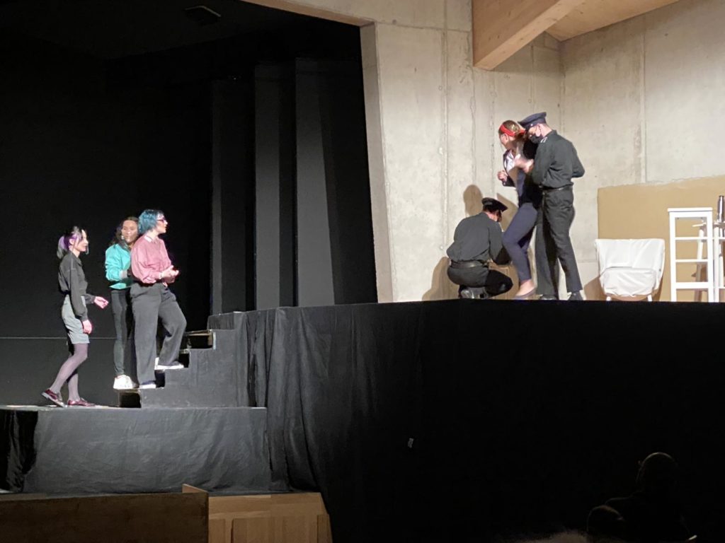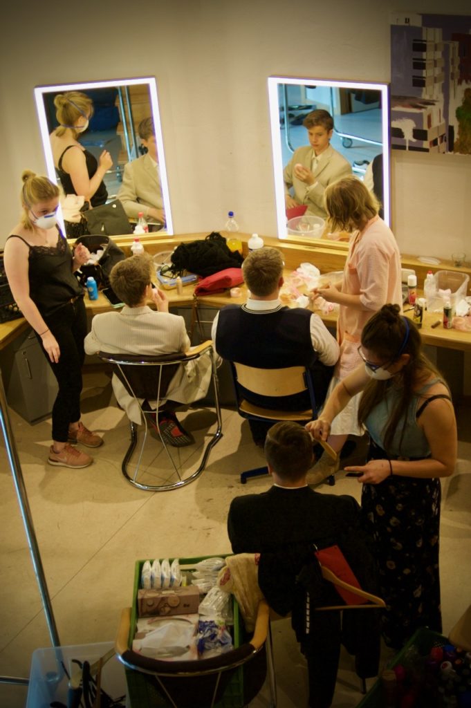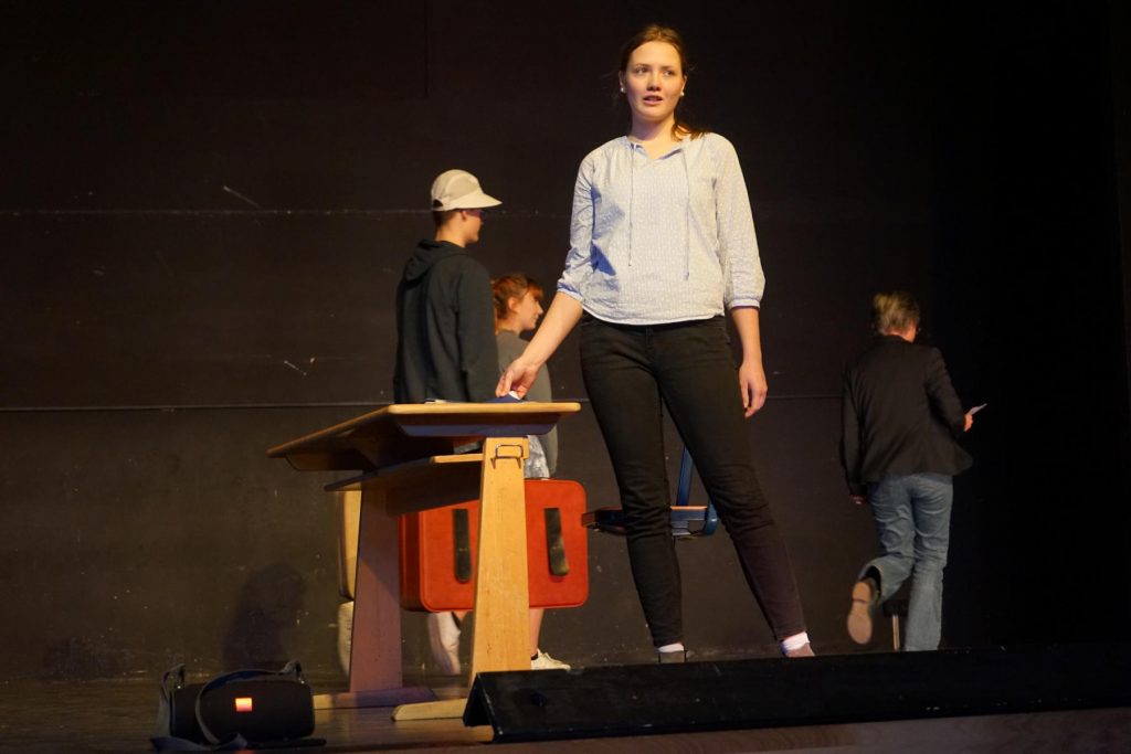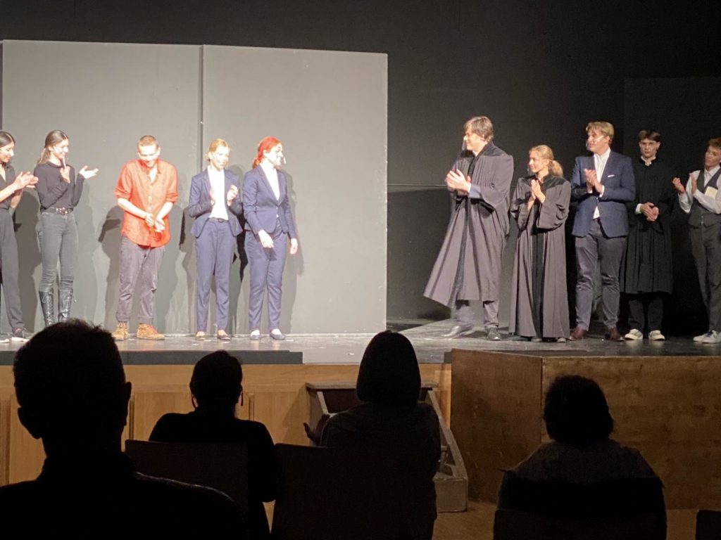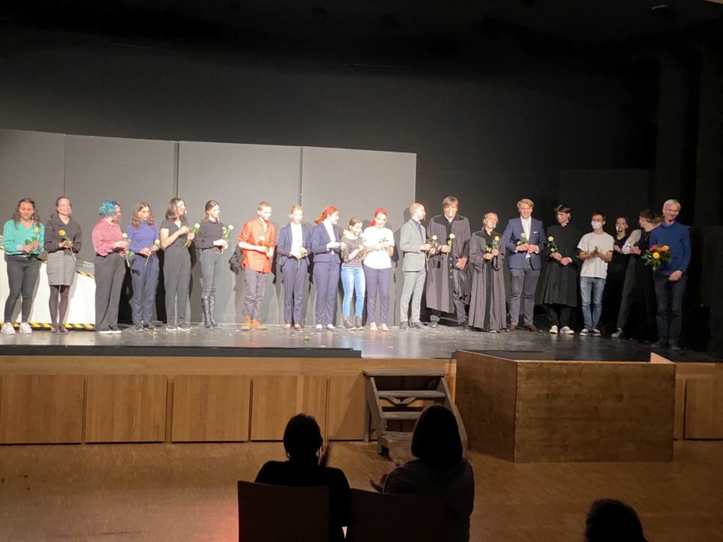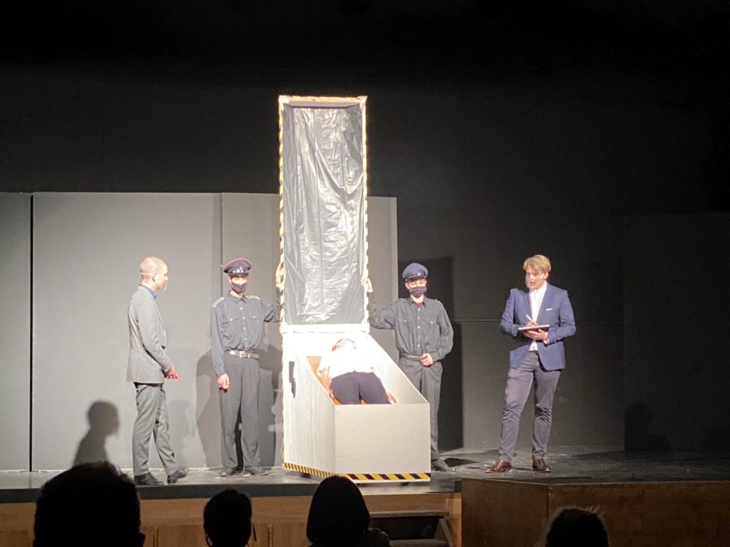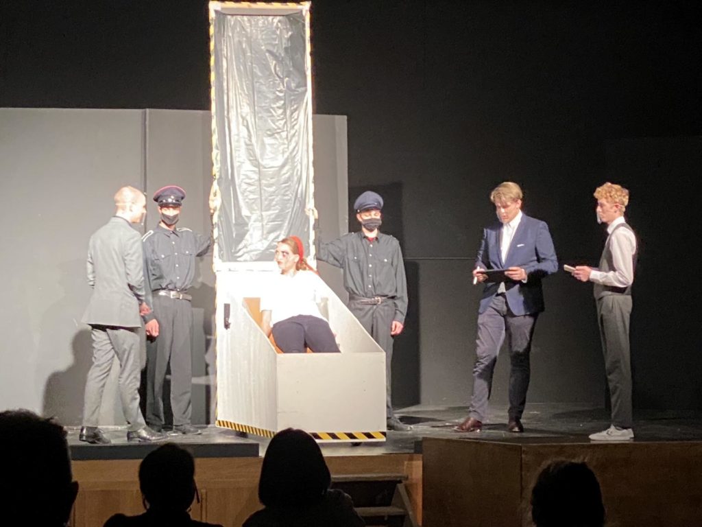 „Verlassen des Hygienebereichs verboten“ steht auf dem Schild. Zunächst könnte das eins der vielen Hinweisschilder aus der Corona-Pandemie sein – aber dann wird doch klar, es ist eine Requisite aus dem Stück „Corpus Delicti“ von Julie Zeh, das sich die zwölfte Klasse als Klassenspiel ausgesucht hat. Und das ausgerechnet an dem Wochenende, an dem die Oberbürgermeisterin von Augsburg den sofortigen Kultur- und Veranstaltungslockdown ab Freitag Abend 21 Uhr verkündet, acht mal aufgeführt werden soll. Bei den beiden öffentlichen Aufführung am Donnerstag und Freitag sah man eine spielfreudige, engagierte zwölfte Klasse einen nicht immer leichten Stoff gelungen und spannend auf die Bühnen bringen – denn es gab mehrere Schauplätze im großen Festsaal. Herzlichen Glückwunsch, liebe zwölfte Klasse zu tollen Theatererlebnissen! Fotos: Angelika Lonnemann (Donnerstag), Susanne Altmann (Freitag)