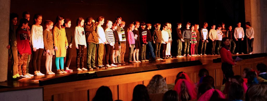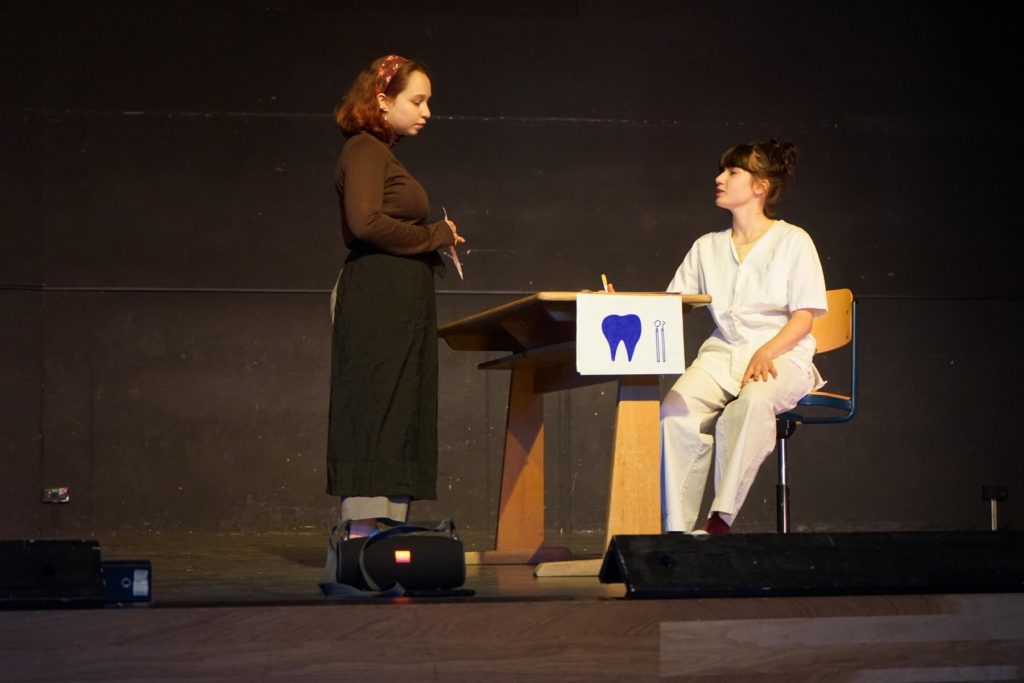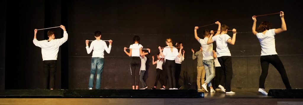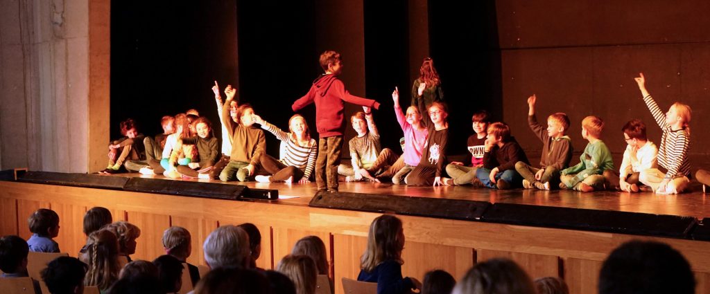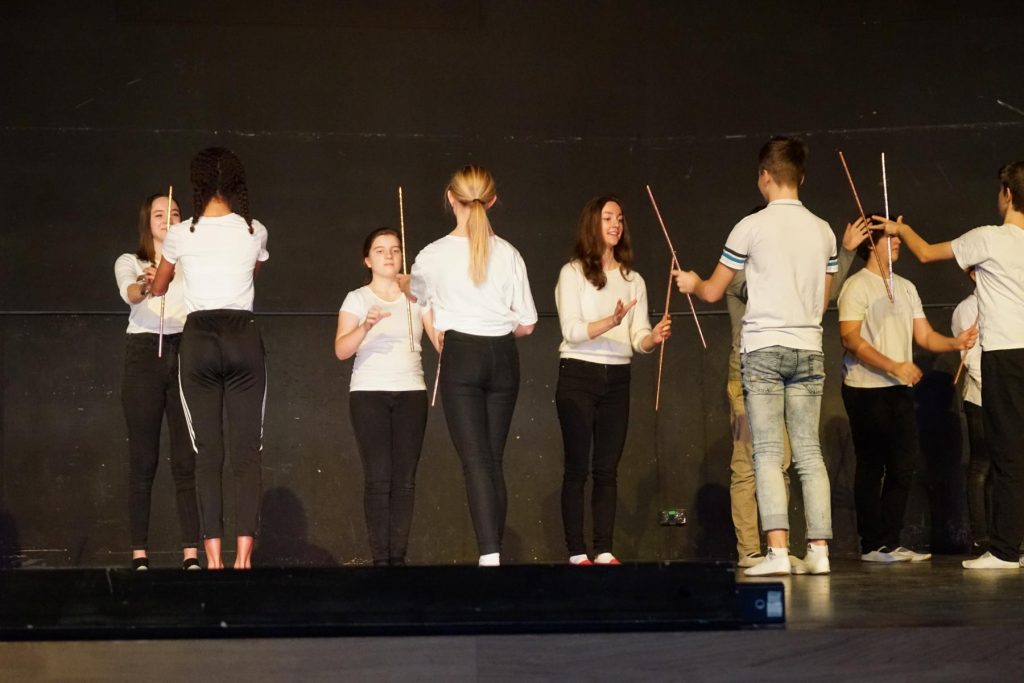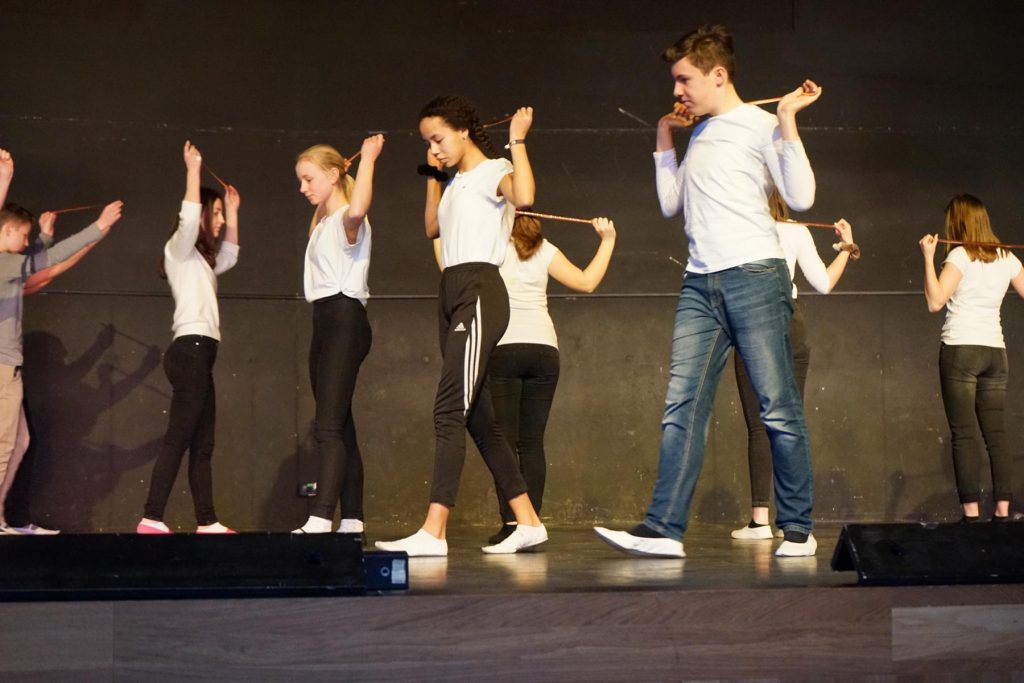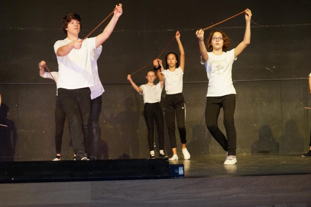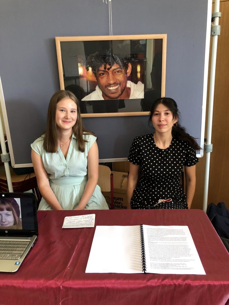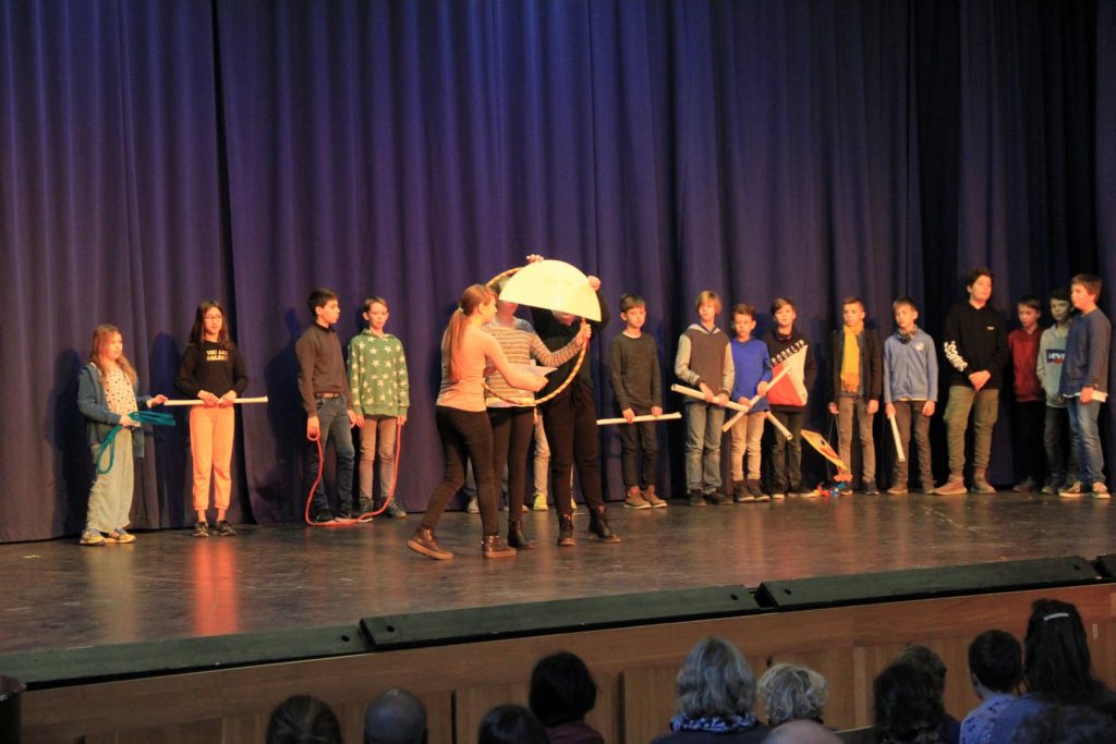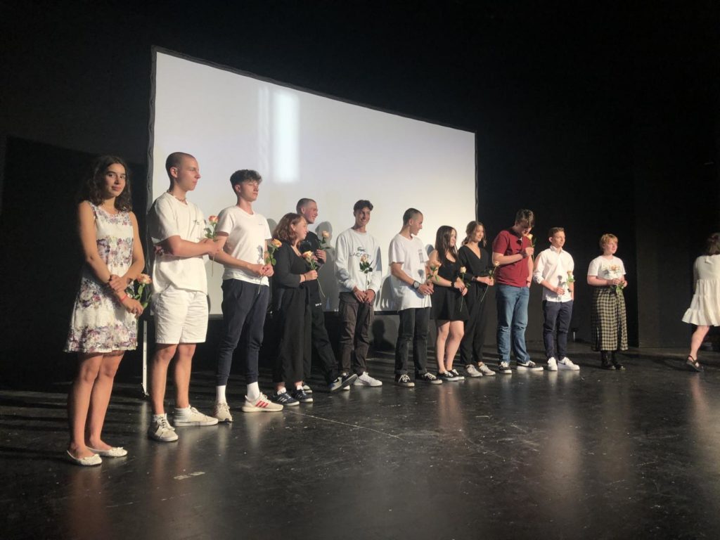 „Verlassen des Hygienebereichs verboten“ steht auf dem Schild. Zunächst könnte das eins der vielen Hinweisschilder aus der Corona-Pandemie sein – aber dann wird doch klar, es ist eine Requisite aus dem Stück „Corpus Delicti“ von Julie Zeh, das sich die zwölfte Klasse als Klassenspiel ausgesucht hat. Und das ausgerechnet an dem Wochenende, an dem die Oberbürgermeisterin von Augsburg den sofortigen Kultur- und Veranstaltungslockdown ab Freitag Abend 21 Uhr verkündet, acht mal aufgeführt werden soll. Bei den beiden öffentlichen Aufführung am Donnerstag und Freitag sah man eine spielfreudige, engagierte zwölfte Klasse einen nicht immer leichten Stoff gelungen und spannend auf die Bühnen bringen – denn es gab mehrere Schauplätze im großen Festsaal. Herzlichen Glückwunsch, liebe zwölfte Klasse zu tollen Theatererlebnissen! Fotos: Angelika Lonnemann (Donnerstag), Susanne Altmann (Freitag)